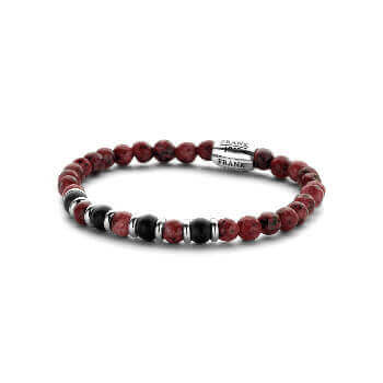 Βραχιόλι Frank 1967 (20cm) με μπίλιες 6mm κόκκινου ζαντ και μαύρου αχάτη και λευκό ατσάλινο στοιχείο.