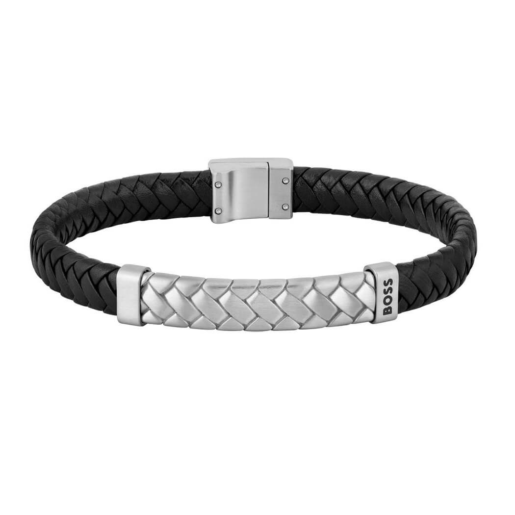 Ανδρικό βραχιόλι Hugo Boss από ανοξείδωτο ατσάλι & μαύρο δέρμα και logo της BOSS.