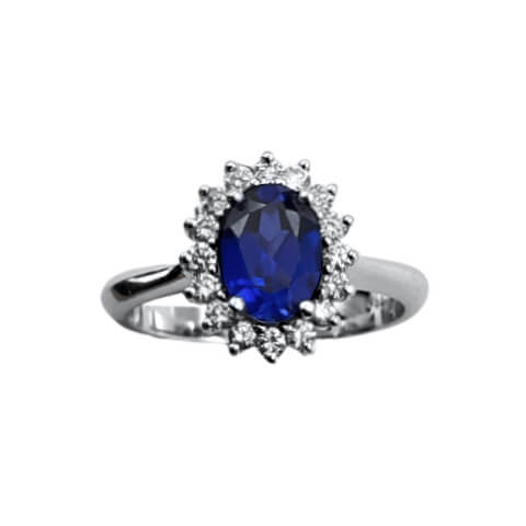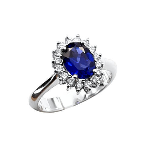 Δαχτυλίδι ροζέτα σε λευκό χρυσό 18K με Oval ζαφείρι και περιφερειακά διαμάντια κοπής Brilliant.