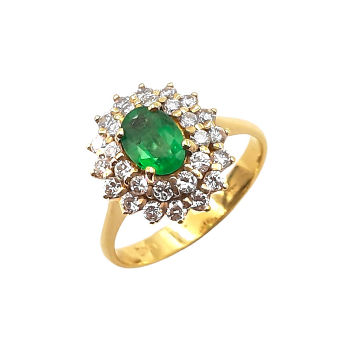 Δαχτυλίδι ροζέτα σε κίτρινο χρυσό 18K με Oval σμαράγδι και περιφερειακά μικρά διαμάντια κοπής Brilliant.