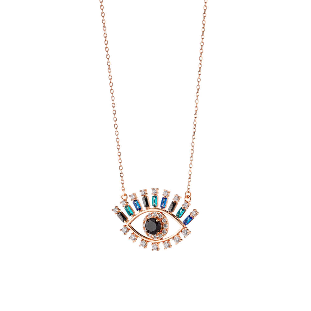 Κολιέ από τη συλλογή Look At Me μεταλλικό ροζ χρυσό με μαύρα, μπλε και λευκά ζιργκόν.