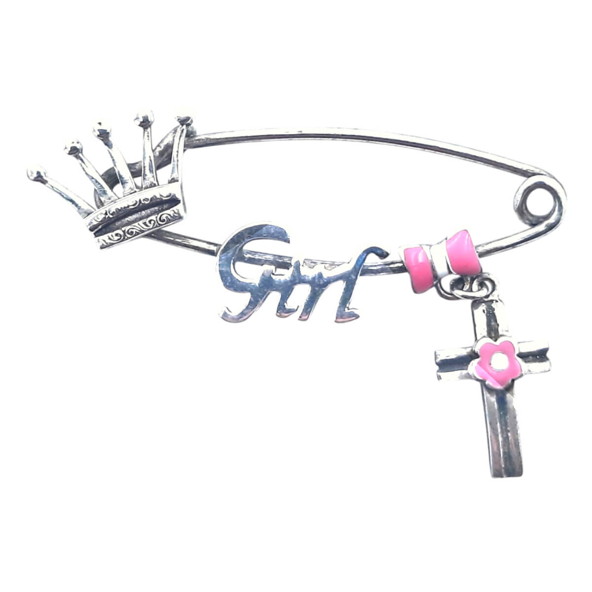 Παιδική παραμάνα από ασήμι 925 με κρεμαστό σταυρό σε ροζ σμάλτο κορώνα.