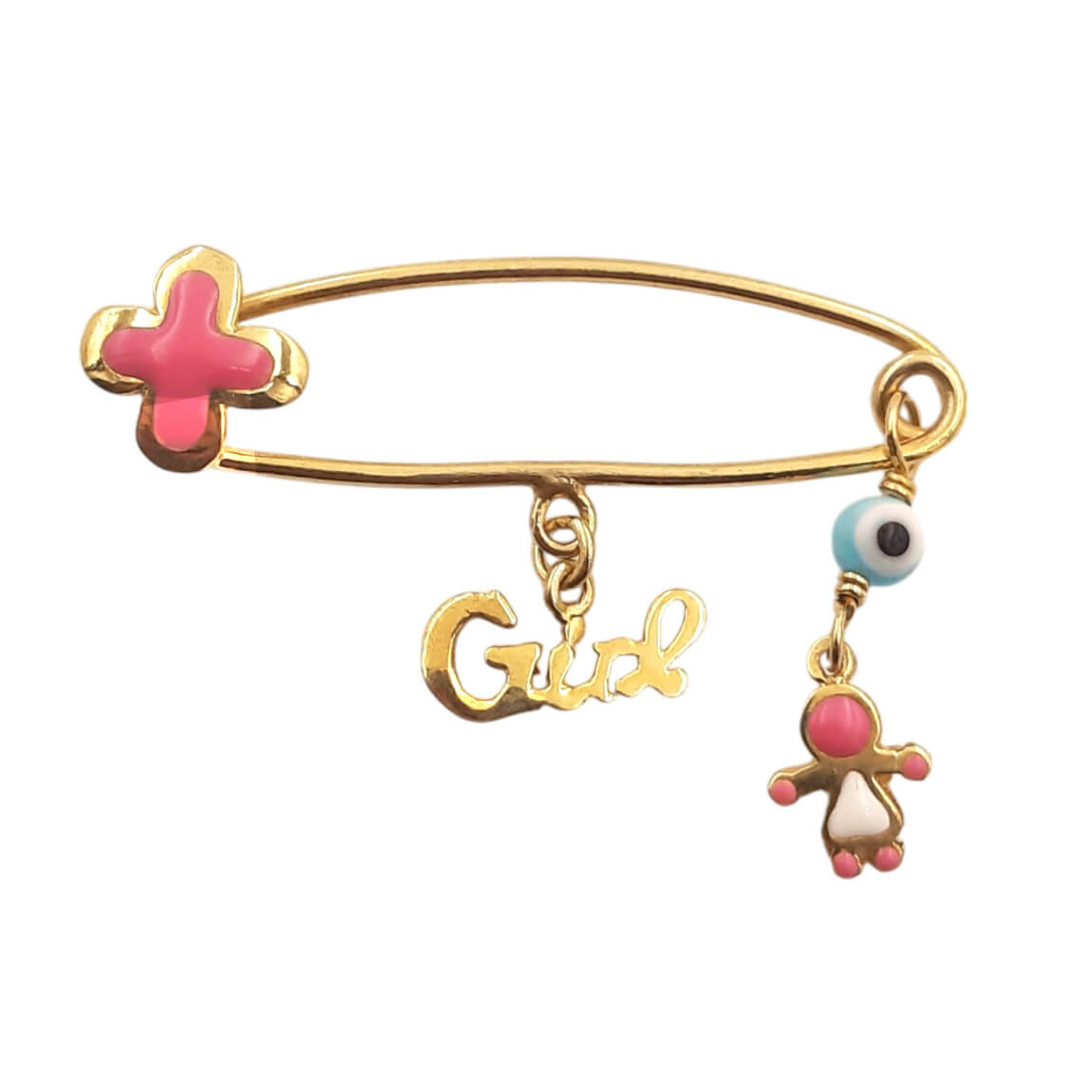 Παιδική παραμάνα από επιχρυσωμένο ασήμι 925 με κρεμαστό ματάκι-κοριτσάκι & σταυρό σε ροζ σμάλτο.