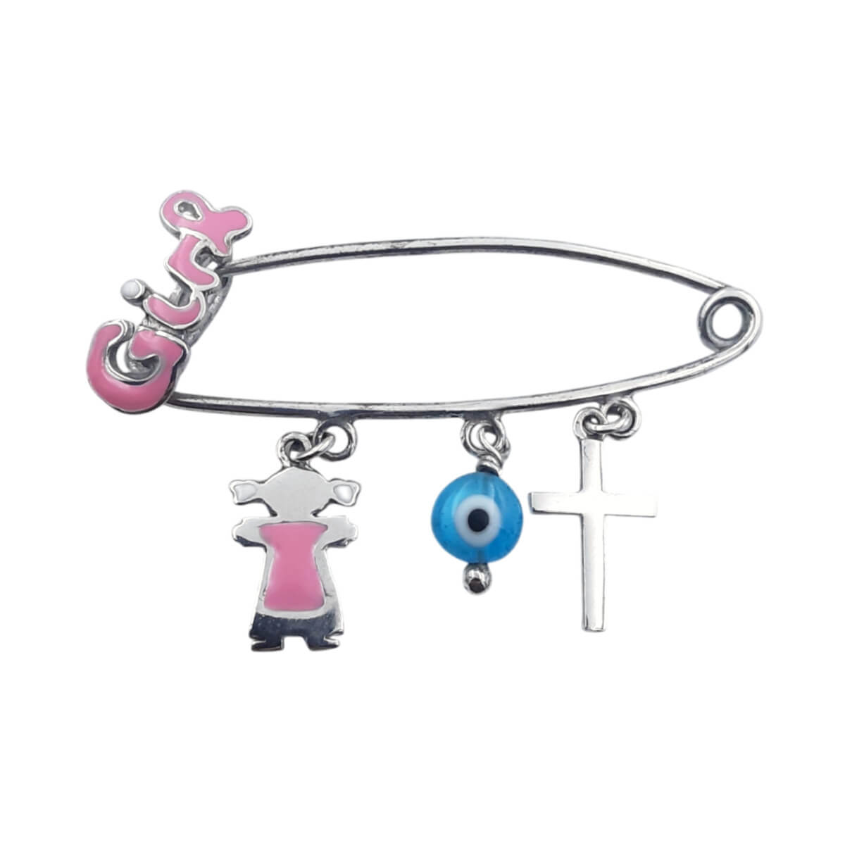 Παιδική παραμάνα από ασήμι 925 με κρεμαστό ματάκι & σταυρό-κοριτσάκι σε ροζ σμάλτο.