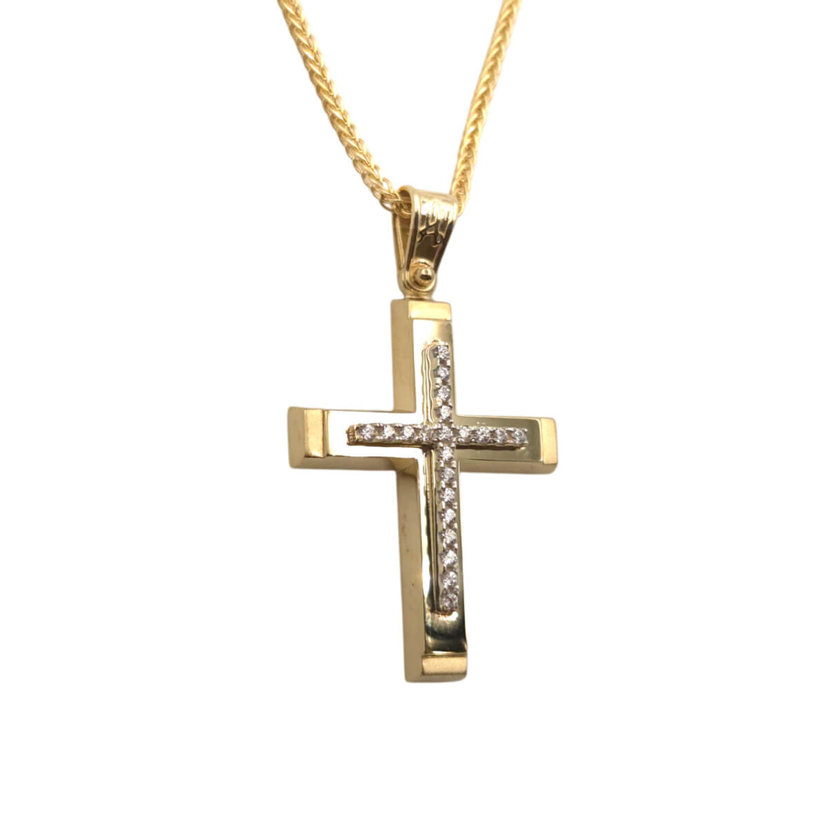 Σταυρός από χρυσό 14Κ με ζιργκόν και λουστρέ φινίρισμα.