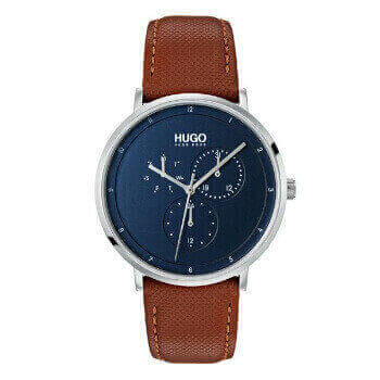Ρολόι HUGO by Hugo Boss από ανοξείδωτο ατσάλι με ένδειξη ημέρας και ημερομηνίας σε μπλέ καντράν και καφέ δερμάτινο λουράκι.